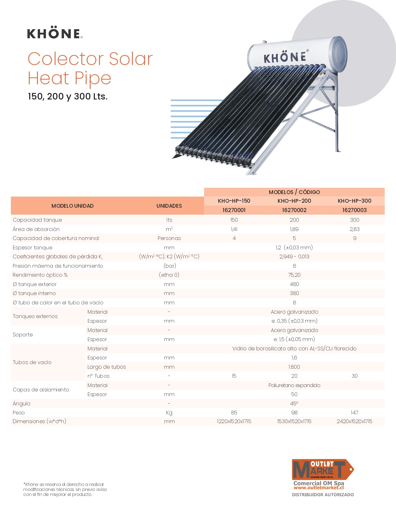 COLECTOR o TERMO SOLAR | KHONE | Presurizado | HEAT PIPE | 150 LITROS / Modelo KHO-HP-150 | GALVANIZADO | 220V (OPCION) Garantia 1 AÑO